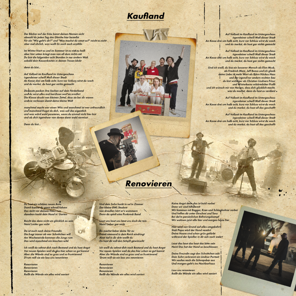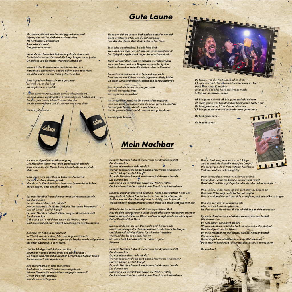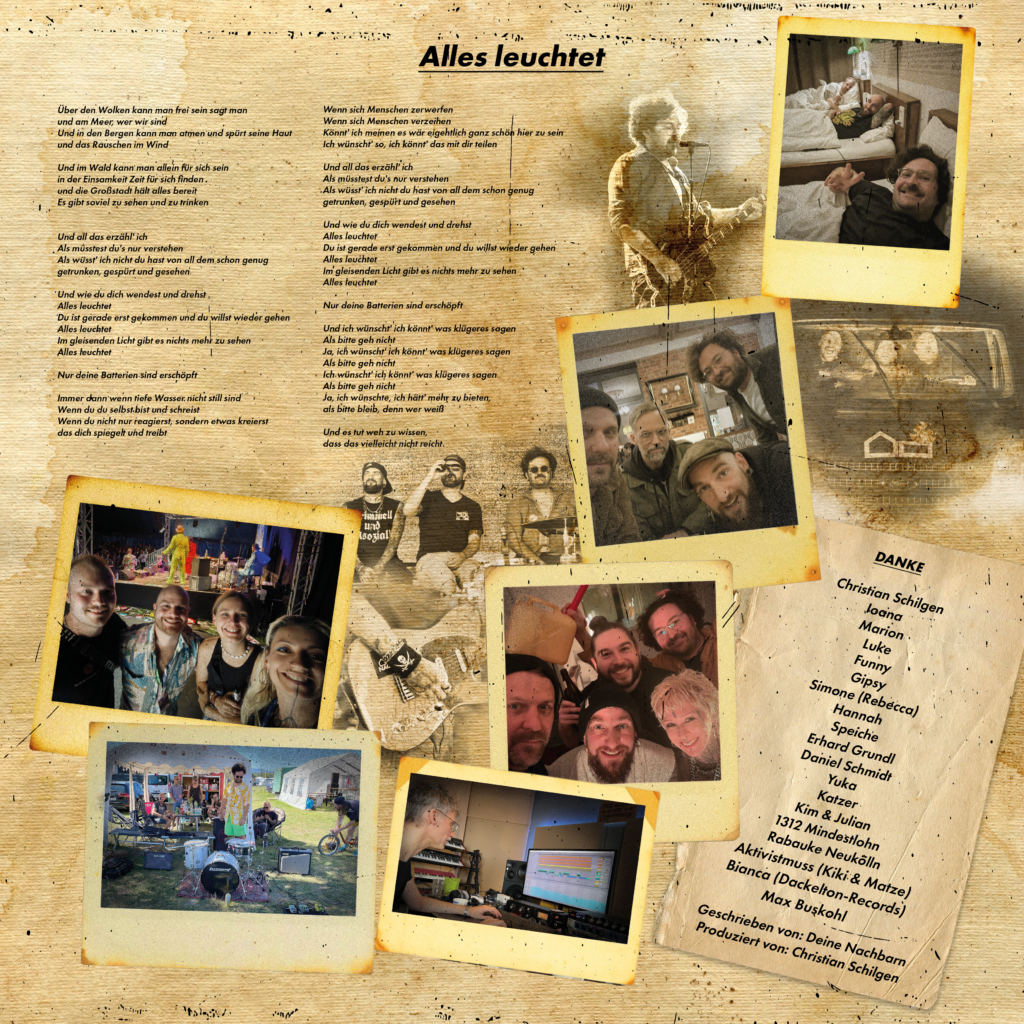 Tachchen! Und schön, dass ihr hier seid. Wir sind „Deine Nachbarn“, die antikapitalistische PunkAlternativeIndieBums-Band aus Berlin-Neukölln. Wir machen Gute-Laune-Musik über schlechte Laune. Unser Debut-Album erscheint am 13.02.2026, produziert von Christian Schilgen (Egotronic, Torsun & The Stereophonics). Auf gute Nachbarschaft und bis bald auf einer unserer Konzerte. Liebe.